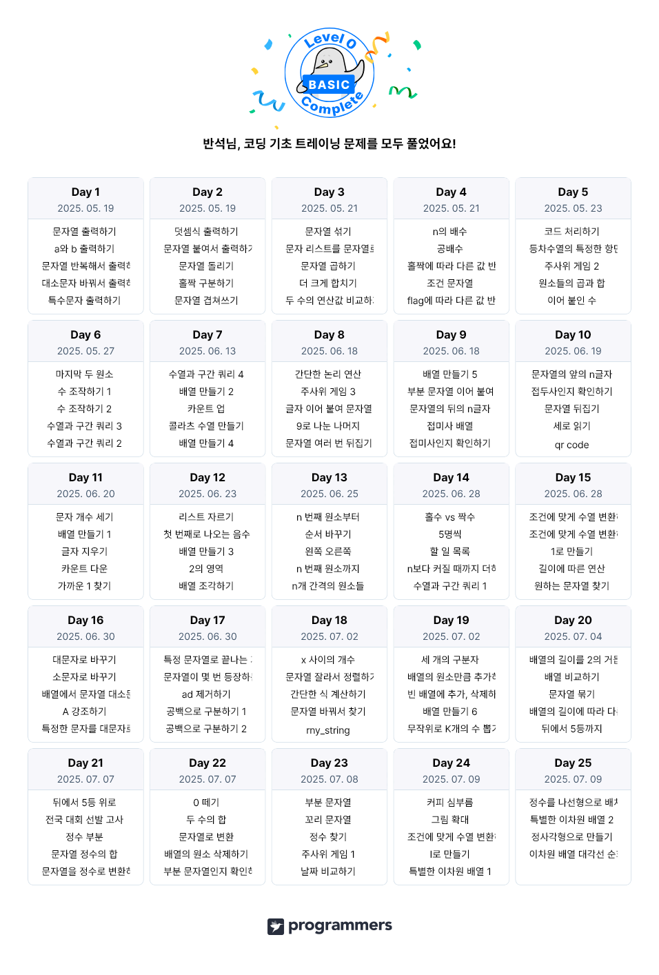5월 19일부터 시작하며 중간 입문도 병행하긴 했으나 25일 과정을 거의 두 배인 두 달 만에 끝냈네요. ㅠㅠ